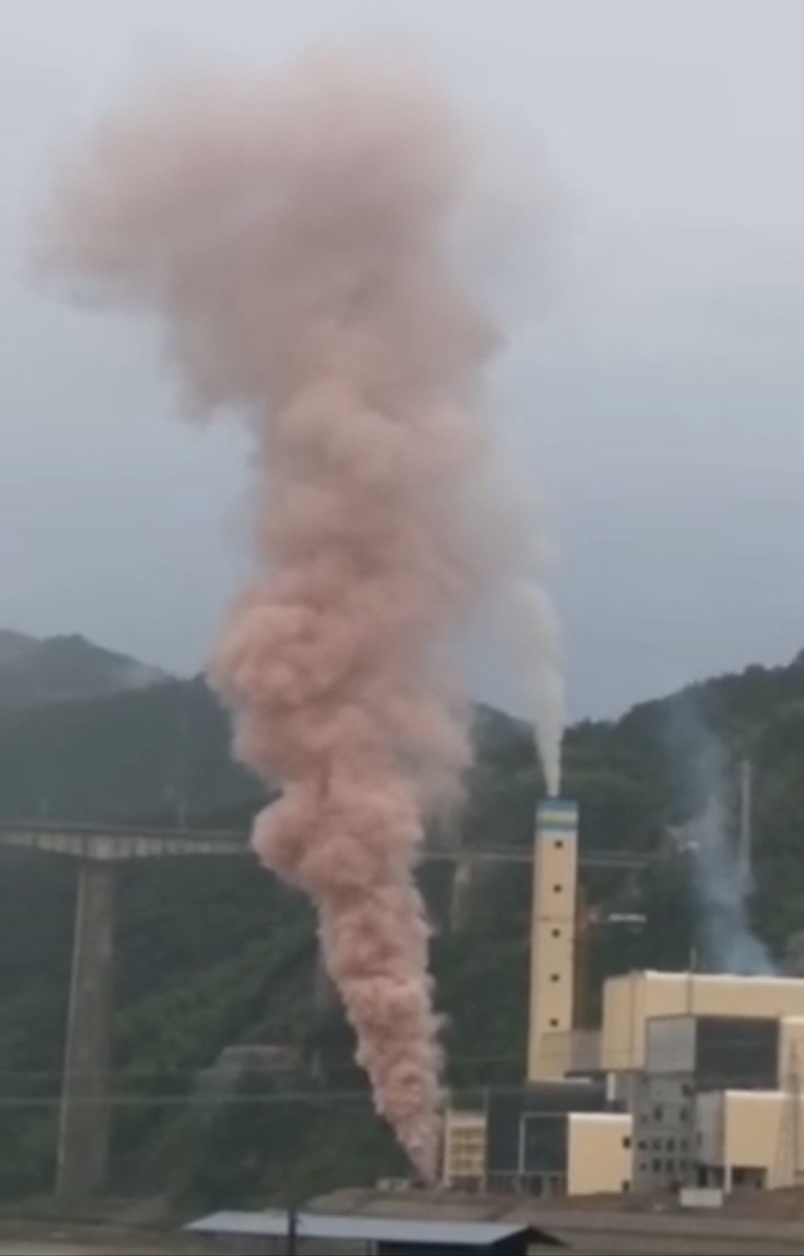 您好,我局执法人员已到现场检查,经调查发现:1.您图片中红色浓烟是由河边临时冲刷管道排出,为管内铁锈和蒸汽混合物,烟第一次冲管浓度较高构成粉红色,现在管内大部分铁锈已冲干净,接下去临时冲管排出的是水蒸气,现场检查时红色浓烟已变为白色水蒸气;2.该企业处于调试阶段,正在配比处理烟气各子系统的占比,达到处理烟气最佳值时才将开始燃烧垃圾,调试结束后将不会再出现此情况。
