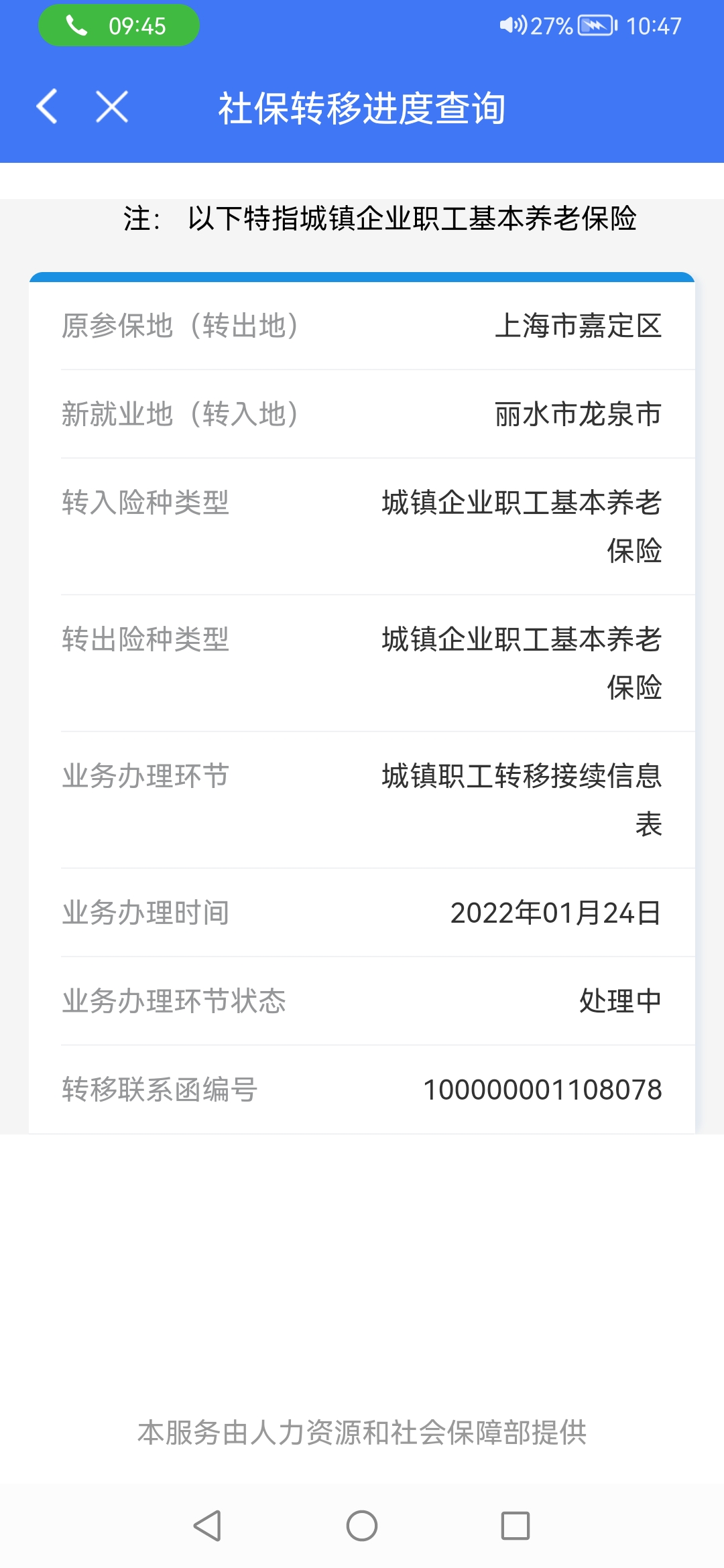 1月份在“掌上12333”申请了跨省社保转移,从上海-转入-龙泉,显示一直在处理中,希望能尽快办结!谢谢!