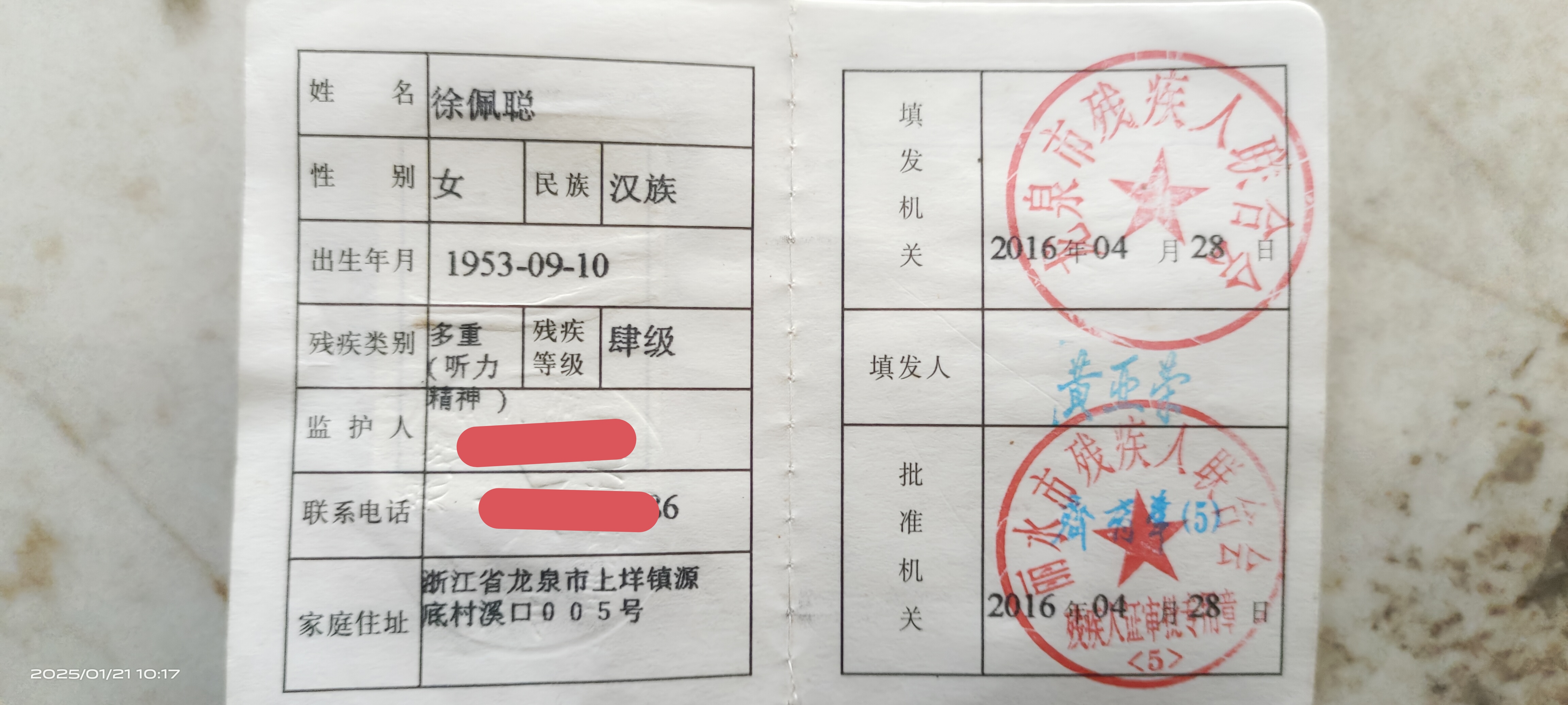 你所反映情况我们已收悉,残联第一时间组织工作人员进行核实,在省残联第二代残疾人证管理系统中数据显示已于2016年6月25日已经申请注销,注销原因不明。2025年1月21日对残疾人档案调取查阅,徐佩聪听力四级于2012年9月25日通过残疾评定,精神四级于2016年4月27日参加通过残疾评定。根据档案查阅真实性,结合当事人的申请要求,经乡镇残联走访核实,情况属实,为了保障残疾人合法权益,减轻残疾人负担,2025年1月22日按照残疾人家属要求将恢复原有残疾类型和残疾等级,从注销到恢复期间相应政策不予补办。相应政策需从恢复后,另行申请。请你及时携带第二代残疾人证到龙泉市人民医院残联窗口更换第三代残疾人证,谢谢您的配合!